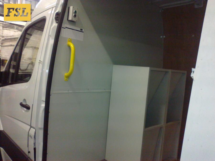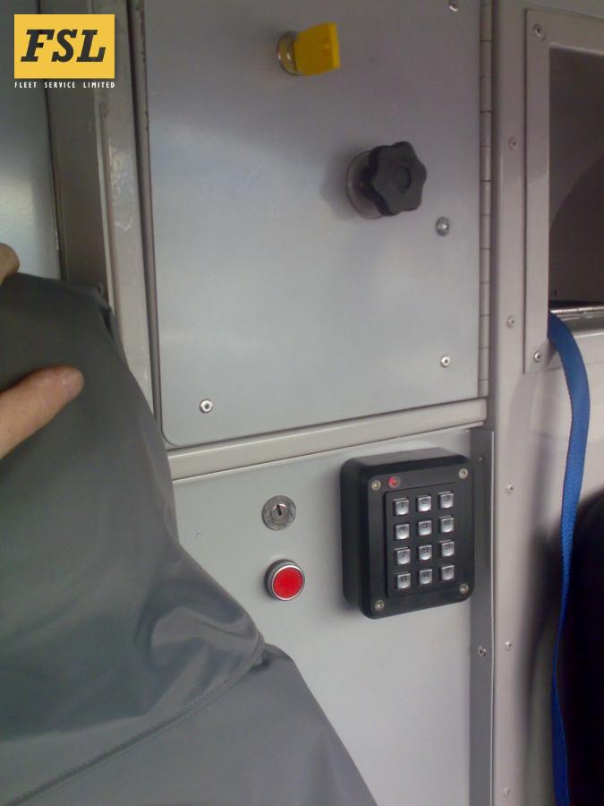 Reverse engineer existing wiring loom, remove old PLC controller and fit new controller with more advanced door control software.Reduce the side loading door (original form of entry) to half width and attach to the side of the vehicle to create 60mm opening. Manufacture a new swinging door and locking system with emergency release.